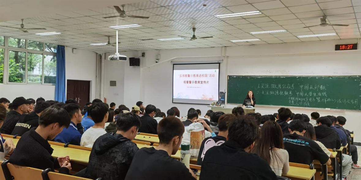 活动中,辅导员讲解国家针对反邪教的相关法规政策,阐述邪教的危害以及远离邪教的必要性,揭露批判了邪教组织的本质和危害,帮助学生增强辨别邪教的能力;接着辅导员宣传“中国反邪教”官网并组织学生一起观看“反邪教”警示教育宣传片,让学生对邪教的传播途径有充分的了解,切实增强防范抵制邪教的能力;最后,在视频观看结束之时,辅导员进行简要概述并引导学生关注"中国反邪教"微信公众号,积极参与线上警示教育活动,力求提高学生防范邪教意识和能力。