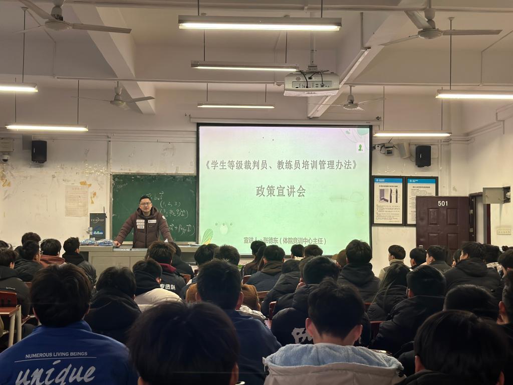 为培养学生德智体美劳全面发展,做好高校全方位、系统的服务育人工作,2024年3月3日,Beat365利用周前会邀请竞训中心主任张德东为全院学生宣讲《学生等级裁判员、教练员培训管理办法》政策。