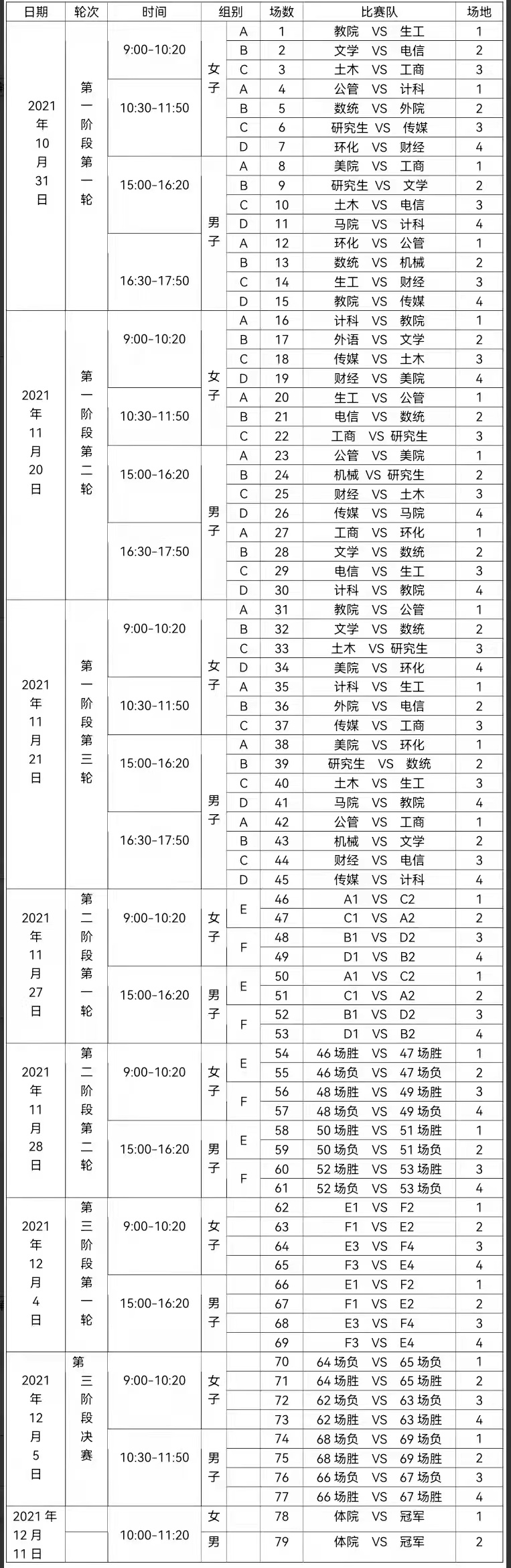 校内各单位: 2021年Beat365唯一官方网站秋季球类运动会篮球比赛竞赛日程上传于Beat365唯一官方网站网站,请相关单位下载查阅。
