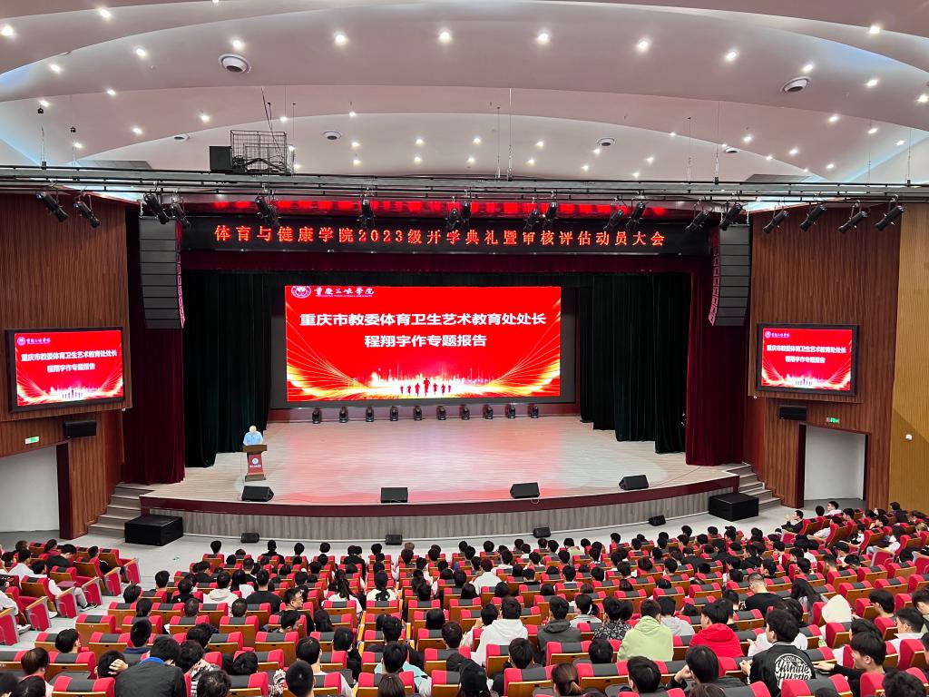 10月21日,Beat365在图书馆学术报告厅召开了2023级开学典礼暨审核评估动员大会,学院党政领导、各系部主任、教师代表及全体学生参会,还特别邀请了重庆市体育卫生艺术教育处处长程翔宇、万州区教育委员会副主任张声勇、万州区体校校长张承、万州区文化和旅游发展委员会办公室主任边伟等市区委领导出席会议。