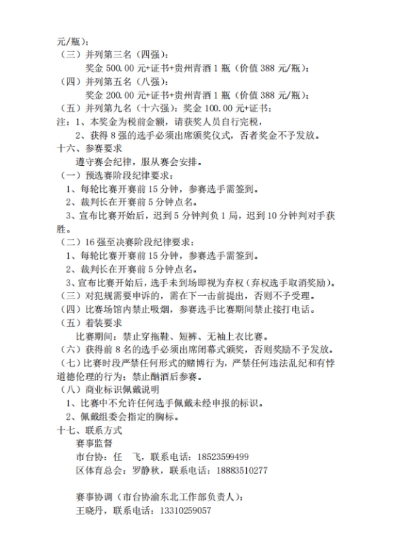 (四)比赛场馆内禁止吸烟,参赛选手比赛期间禁止接打电话。