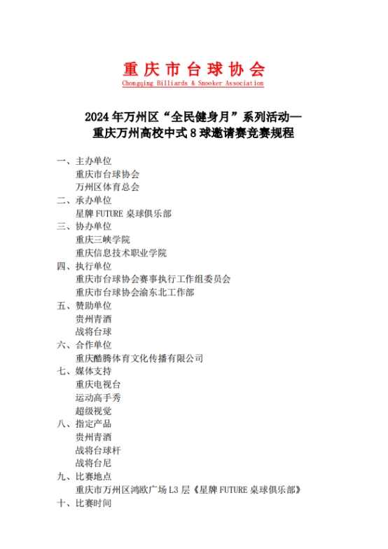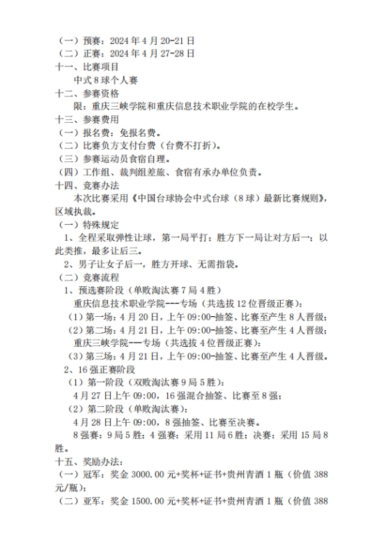 1、选拔赛四强晋级2024重庆市万州区高校中式8球邀请赛16强正赛(正赛比赛规程详见附件)。