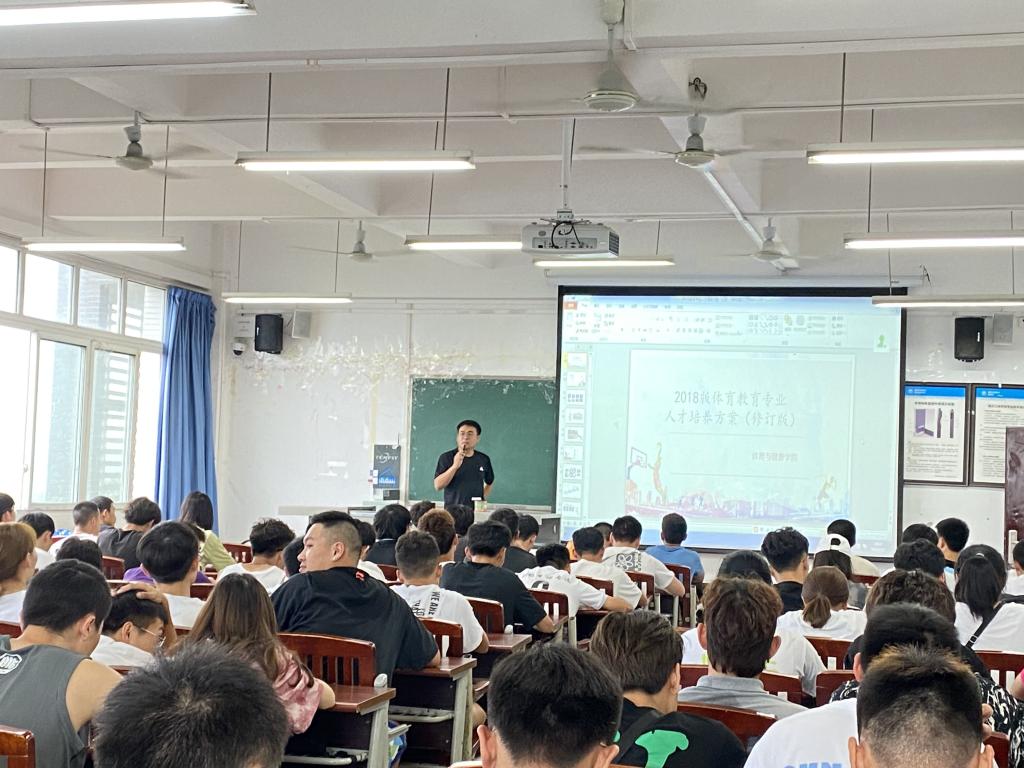 首先,侯圣苍副教授就2019和2020级人才培养方案的制定和修改依据作了充分说明,即OBE理念和师范认证相关标准。随后,侯老师围绕人才培养方案,详细讲解了学院的人才培养目标、毕业要求、主干学科、核心课程、学分构成、学时学分分配等各方面内容,让同学们对体育教育专业的总体培养规划有了详尽了解。
